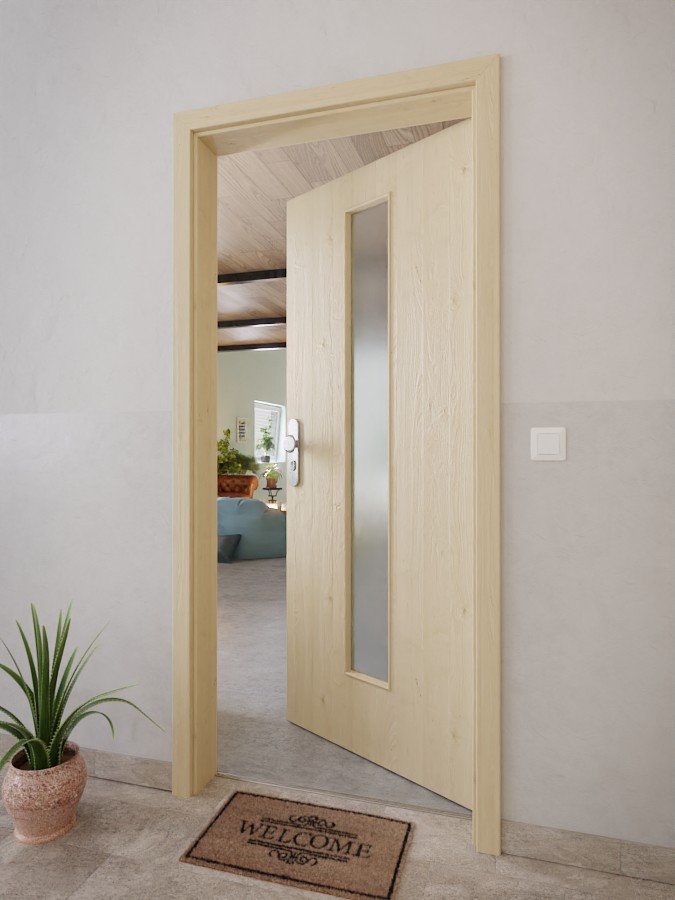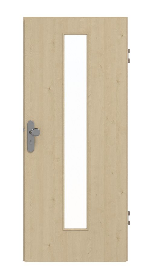 Dokładnie pośrodku skrzydła drzwi znajduje się otwór o szerokości nieco poniżej 20 cm, otoczony listwami szklanymi. Dzięki jasnym odcieniom drewna dekor Natura Ahorn tworzy spokojną atmosferę. Warstwa wierzchnia CPL charakteryzuje się odpornością na zarysowania, uderzenia i działanie światła.