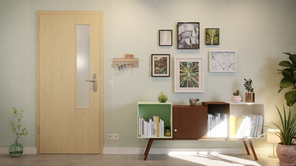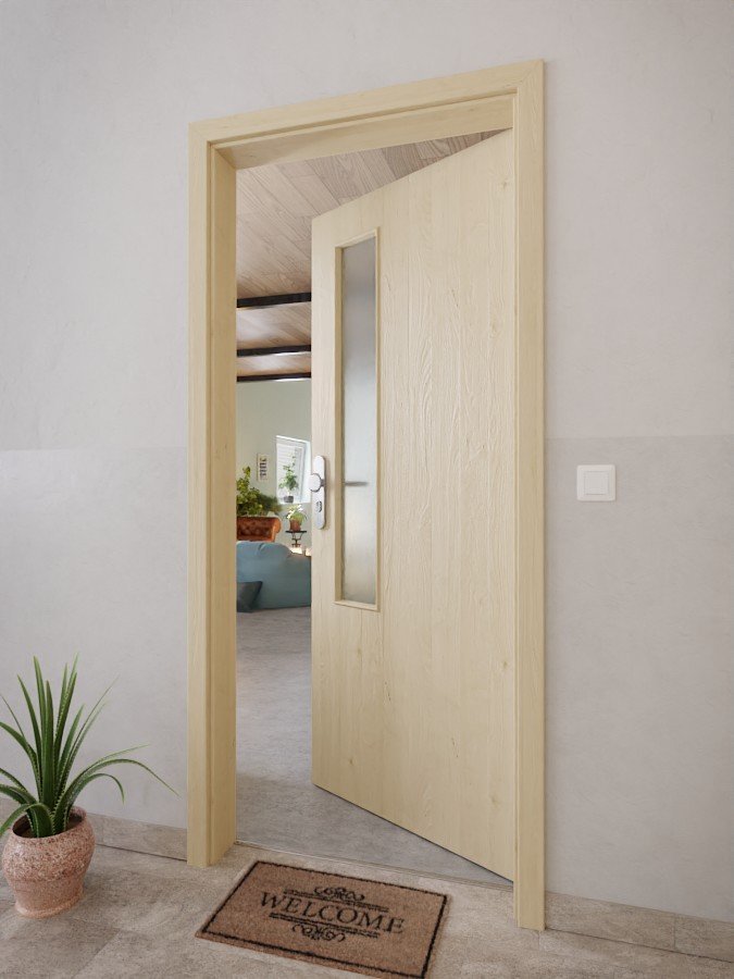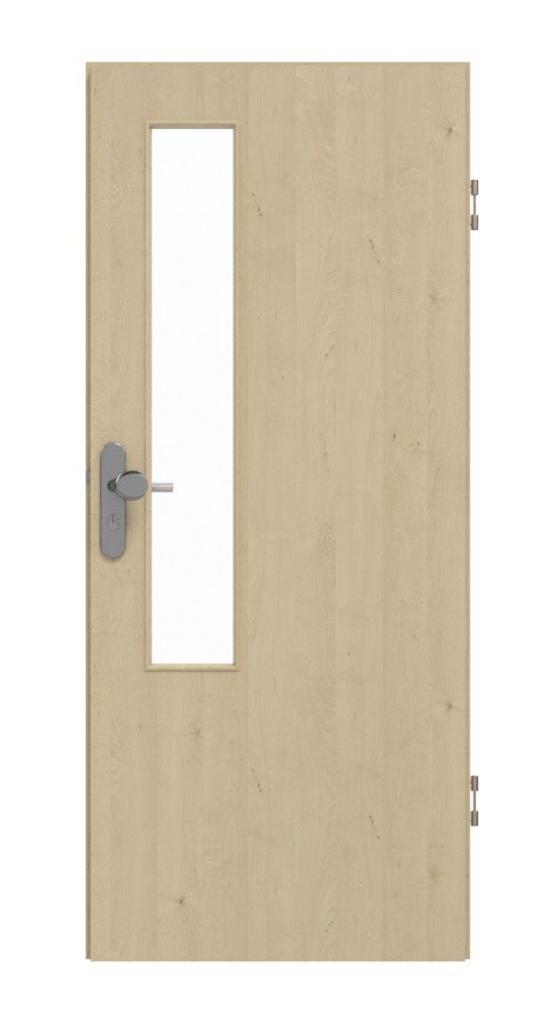 Szczególnym elementem wystroju jest wąskie wycięcie na szybę po stronie zamka w górnej części drzwi. Dekor Natura Klon prezentuje się jasno i przytulnie dzięki autentycznemu usłojeniu drewna. Warstwa wierzchnia CPL charakteryzuje się odpornością na zarysowania, uderzenia i działanie światła.