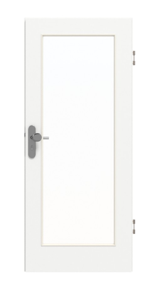 Duży, prostokątny otwór okienny pośrodku drzwi nadaje pomieszczeniom jasną i przestronną atmosferę. Listwy przyszkleniowe na wszystkich czterech bokach dopełniają wygląd. Dzięki ponadczasowemu dekorowi w kolorze szarotki drzwi tworzą przytulną atmosferę. Odporna na zarysowania i uderzenia powierzchnia z płyty HPL pozwala błyskawicznie usunąć codzienne zabrudzenia.