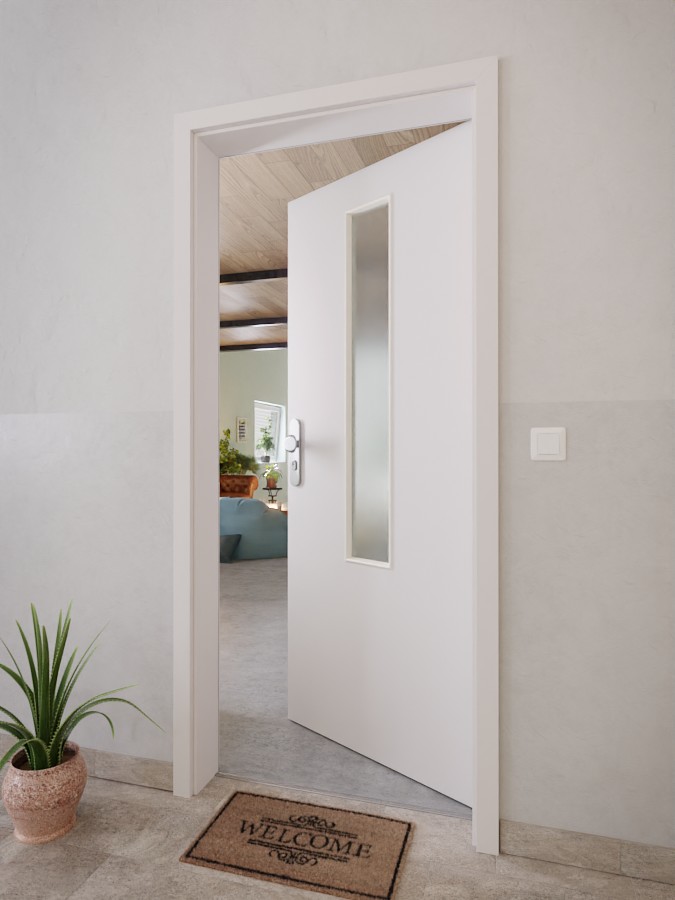 Estetyczne drzwi wejściowe do mieszkania z wbudowanym, opuszczanym uszczelnieniem podłogowym przeciwko nieprzyjemnym przeciągom: