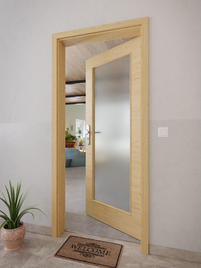 Skrzydło drzwiowe, zawiasy, zamek cylindryczny, szklenie, obniżona uszczelka podłogowa
