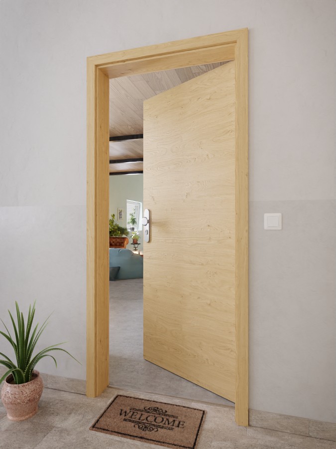 W środku skrzydła drzwiowego znajduje się płyta wiórowa pełna, która zapewnia wysoką stabilność i bezpieczeństwo.