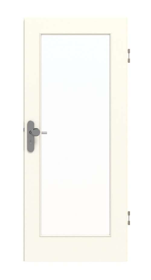 Skrzydło drzwi posiada duży, prostokątny otwór, który zapewnia dodatkowe oświetlenie. Wzór w kolorze platynowej bieli zachwyca klasycznym wzornictwem i aksamitną fakturą. Gładka i jednolita powierzchnia drzwi z HPL ułatwia czyszczenie.