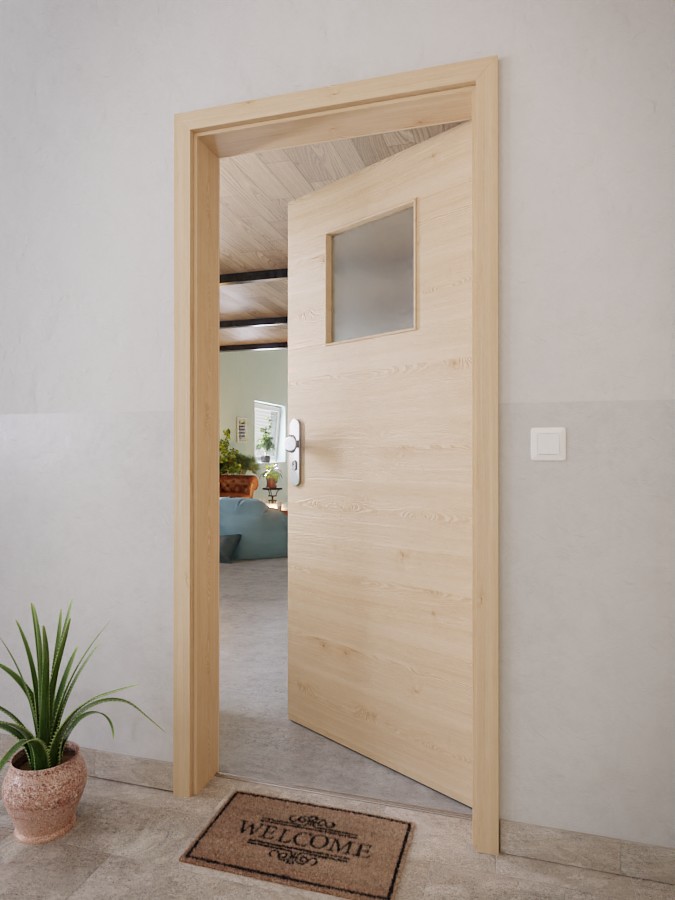 Skrzydło drzwiowe, zawiasy, zamek cylindryczny, szklenie, obniżona uszczelka podłogowa