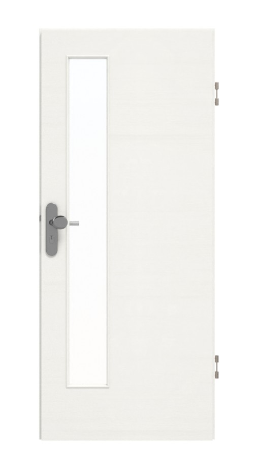 Wąskie, prostokątne wycięcie na szybę zapewnia dyskretny dopływ światła. Poprzeczne słoje drewna w dekorze Authentic Bianco idealnie harmonizują z białą barwą. Powierzchnia paneli laminowanych wysokociśnieniowych nie tylko posiada atrakcyjne wykończenie wizualne, ale jest również wyjątkowo odporna na niepożądane zarysowania lub uderzenia.