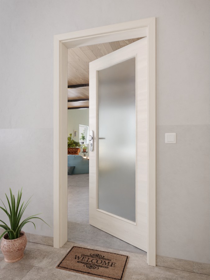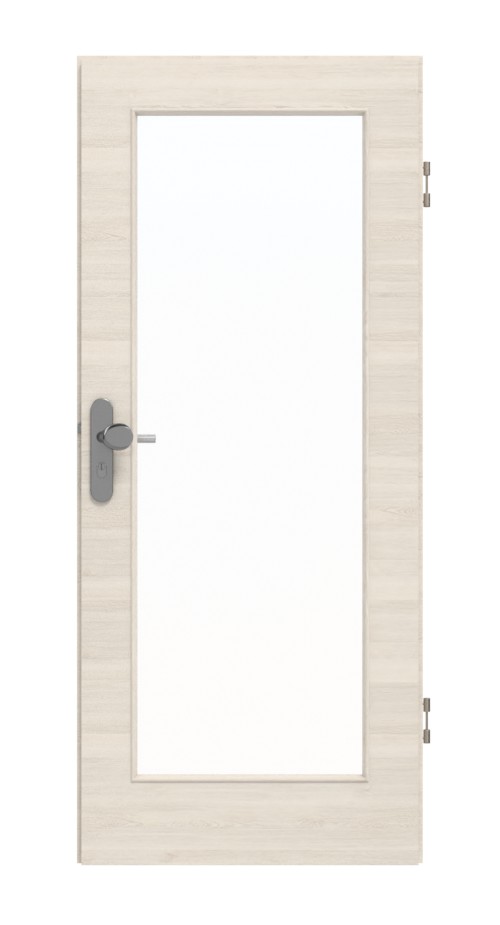 Skrzydło drzwiowe, zawiasy, zamek cylindryczny, szklenie, obniżona uszczelka podłogowa