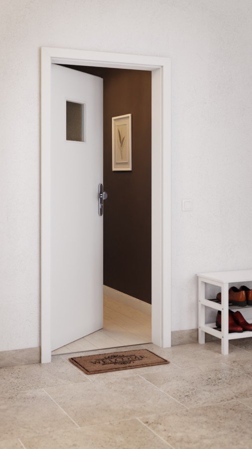 Rdzeń skrzydła drzwiowego stanowi płyta wiórowa . Model ten skutecznie zapobiega powstawaniu zniekształceń spowodowanych różnicami temperatur dzięki klasie klimatycznej 3. Już w standardzie niezawodne zawiasy, zamek i opuszczana uszczelka podłogowa należą do podstawowego wyposażenia drzwi.