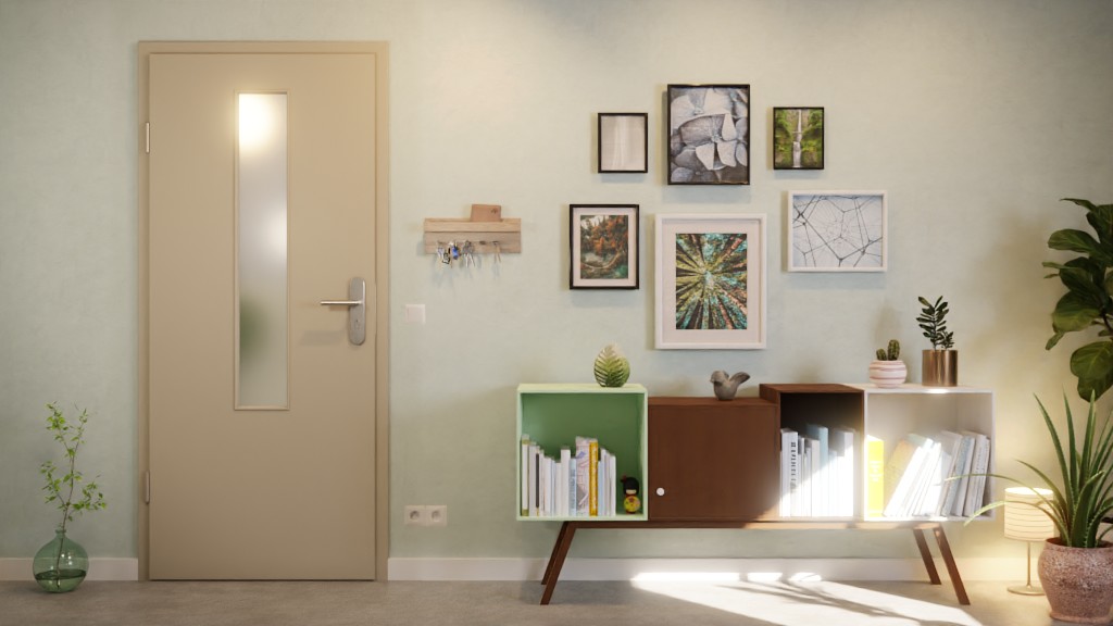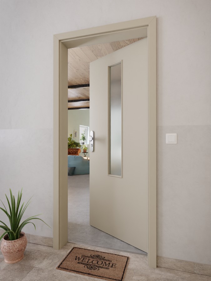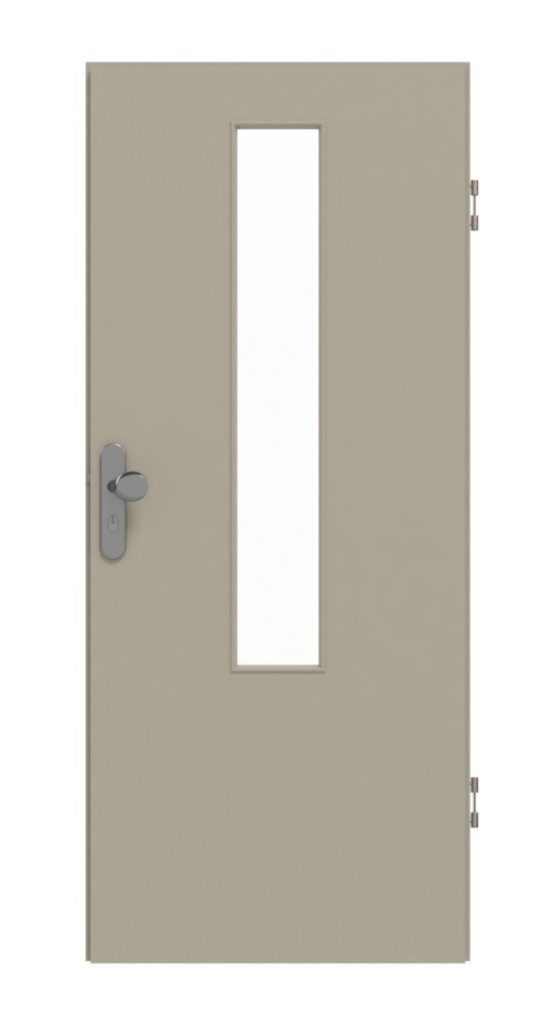Dokładnie pośrodku skrzydła drzwiowego znajduje się wąskie, prostokątne przeszklenie, które rozciąga się na około dwie trzecie długości. Dekor G-TEC w kolorze jedwabnej szarości wyróżnia się matową powierzchnią o praktycznych właściwościach zapobiegających pozostawianiu odcisków palców.