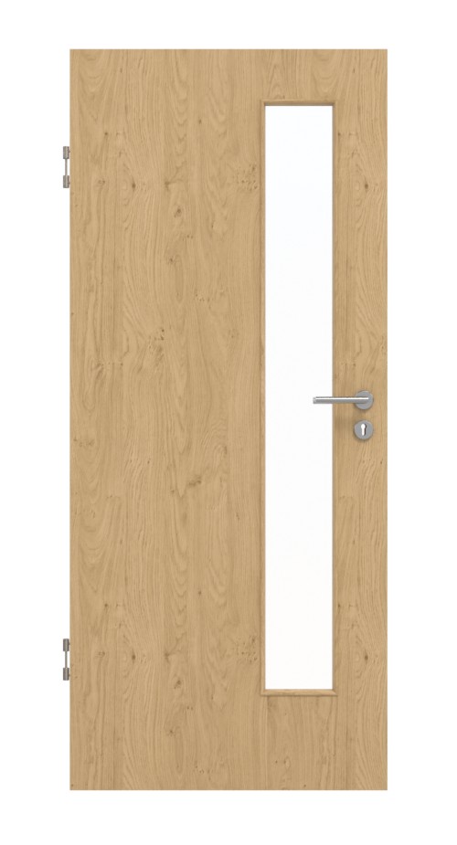 Wzdłuż całej długości skrzydła drzwiowego, po stronie zamka, znajduje się smukły wycięty fragment szyby. Dekor drewniany Authentic Asteiche dzięki pionowym słojom i brązowej barwie emanuje naturalnością i przytulnością. Ponadto powierzchnia HPL przekonuje swoją wysoką wytrzymałością oraz nowoczesną łatwością pielęgnacji.