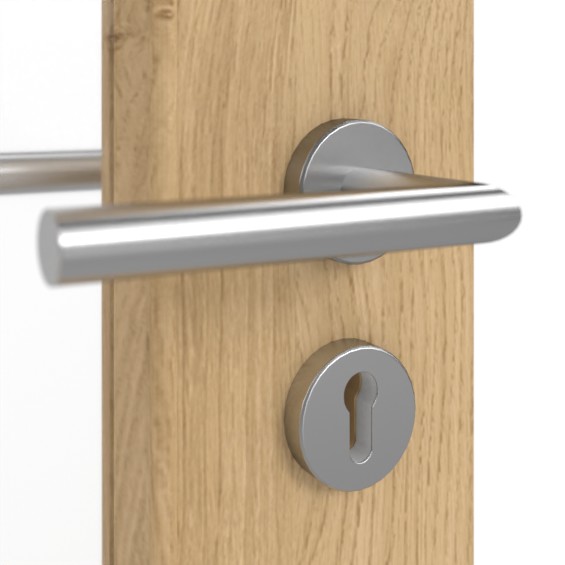 Płyta wiórowa pełna w pomieszczeniu wewnętrznym zapewnia wysoką stabilność. Intensywne użytkowanie nie ma wpływu na drzwi o klasie wytrzymałości S. Oprócz listew przyszybowych, do standardowych dodatków należą zamek z wkładką cylindryczną i dwa 3-częściowe zawiasy.