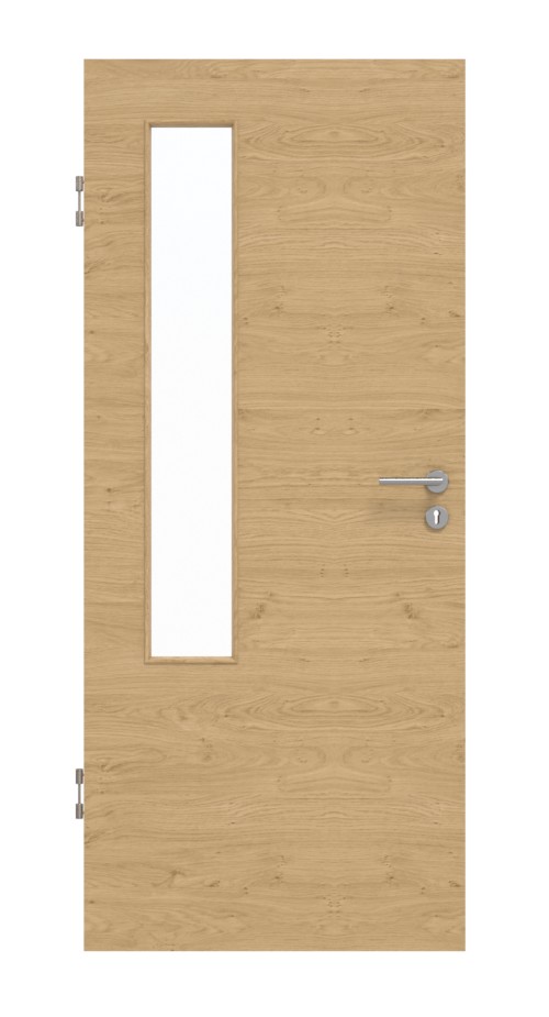 Nieco więcej światła w pomieszczeniu zapewnia wąski, umieszczony po stronie taśmy wycięcie w szkle. Naturalny urok dekoracji Authentic Asteiche Crosswynika z linii słojów, które biegną poprzecznie przez powierzchnię drzwi. Dzięki swojej wytrzymałości łatwy w pielęgnacji dekor HPL jest odporny na ścieranie i zarysowania.