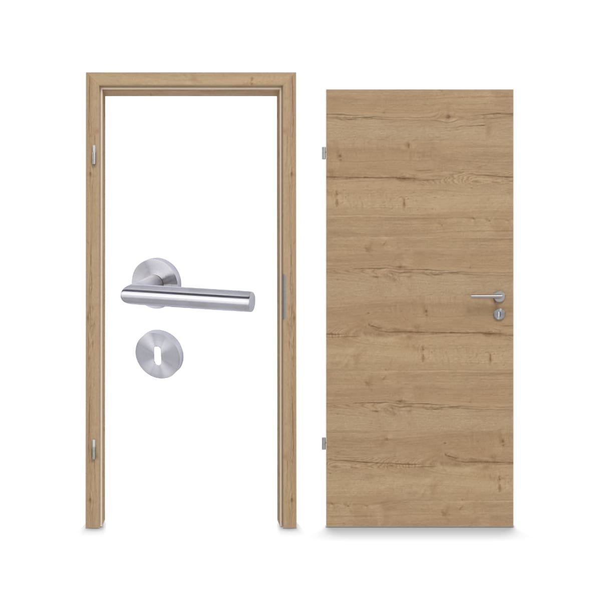 Pragmatyczne zakupy: Zestaw drzwi wewnętrznych w kolorze Authentic Risseiche Quer od Garant wyróżnia się praktycznością, ponieważ zawiera skrzydło drzwiowe, ościeżnicę i klamkę.