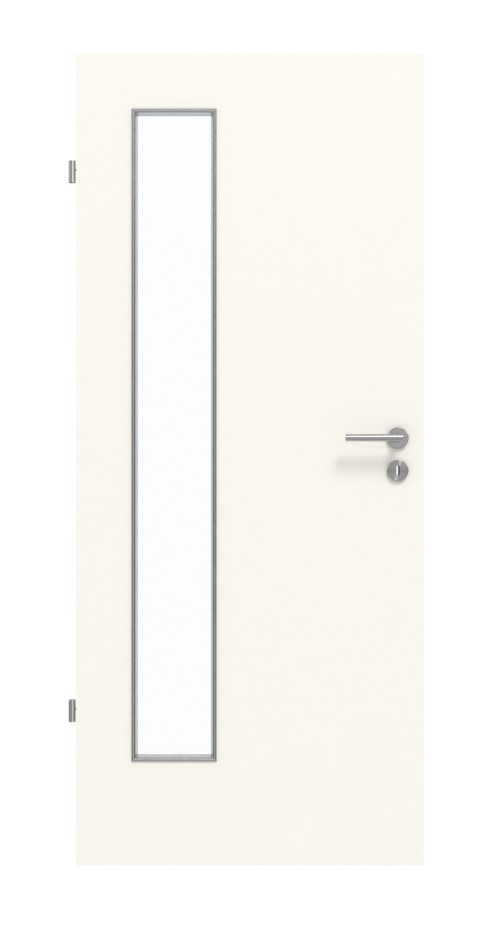 Swoją nowoczesną estetykę drzwi zawdzięczają wąskiemu przeszkleniu po stronie zawiasów. Dzięki jasnej powierzchni w kolorze bieli perłowej model ten pasuje do każdego stylu wnętrza. Wytrzymała warstwa HPL jest odporna na ścieranie, uderzenia i zarysowania oraz wyjątkowo odporna na działanie światła.