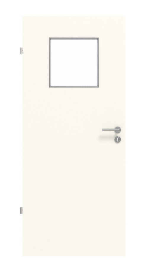 Pięknym elementem dekoracyjnym w górnej części jest kwadratowe wycięcie na szybę. Dekor Pearl White sprawia wrażenie jasnego i przyjaznego. Wytrzymała powłoka HPL jest szczególnie odporna na zarysowania i ścieranie oraz na dostępne w handlu środki czyszczące.