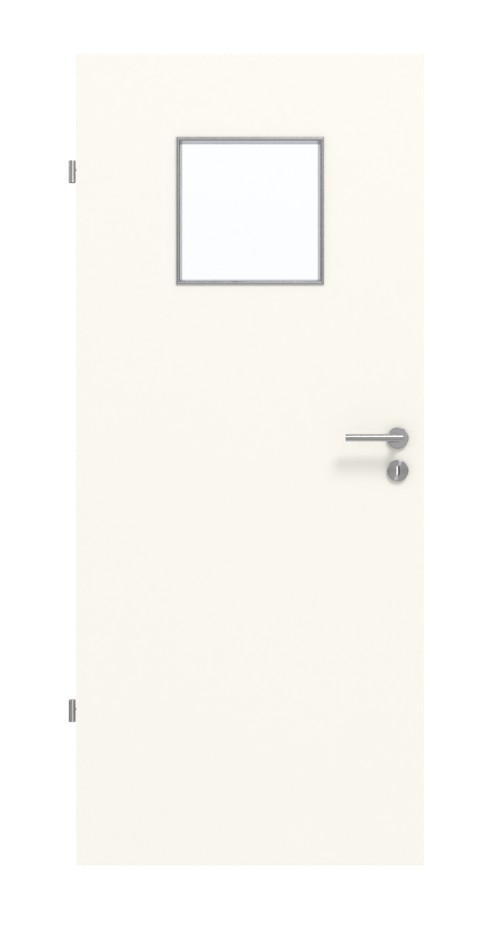 Prostoliniowy element wystroju stanowi umieszczone na środku kwadratowe wycięcie na szybę w górnej części drzwi. Dekor w kolorze bieli perłowej uzupełnia delikatna struktura. Dzięki subtelnemu designowi pasuje do każdego środowiska montażu. Wytrzymała i odporna na światło warstwa wierzchnia HPL jest odporna na zarysowania i ścieranie i została zaprojektowana z myślą o codziennym intensywnym użytkowaniu.