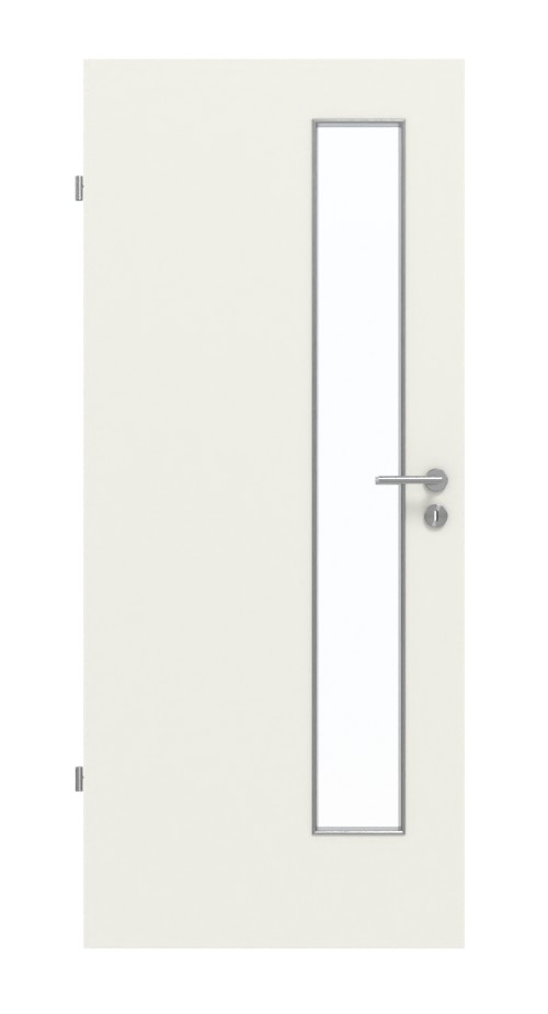 Skrzydło drzwiowe posiada po stronie zamka przeszklenie o szerokości prawie 20 cm, które nadaje mu nowoczesny charakter. Spokojny charakter wyróżnia biało-szary dekor Rain. Zarysowania, ścieranie i uderzenia nie mają wpływu na niezwykle wytrzymałą powierzchnię HPL, odporną na działanie popularnych środków czyszczących.