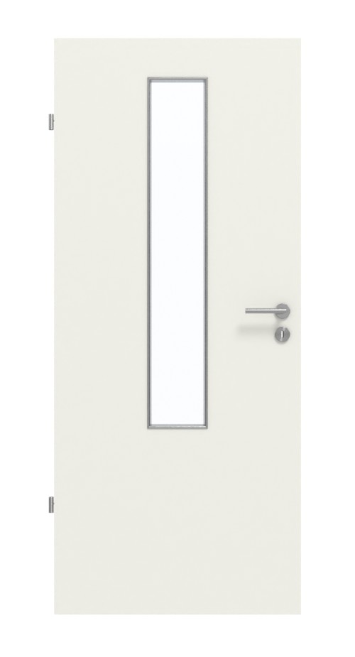 Prostokątne przeszklenie, znajdujące się dokładnie pośrodku skrzydła drzwiowego, ma szerokość prawie 20 cm. Subtelne połączenie szarego i białego koloru charakteryzuje nowoczesny design powierzchni Rain. Wytrzymała okładzina HPL jest odporna na zarysowania, uderzenia i ścieranie oraz łatwa w czyszczeniu.