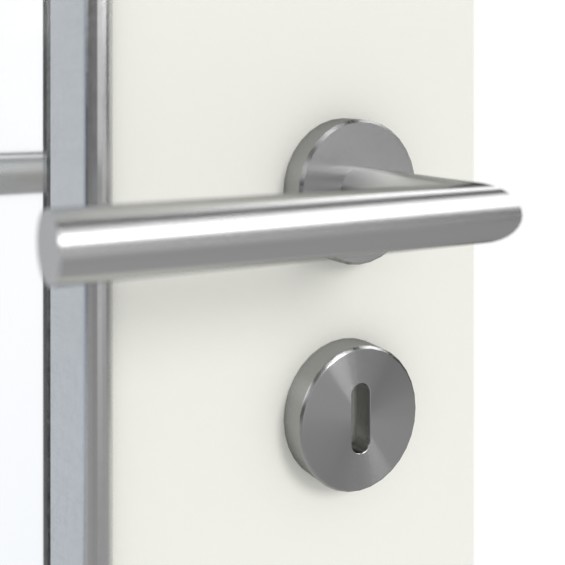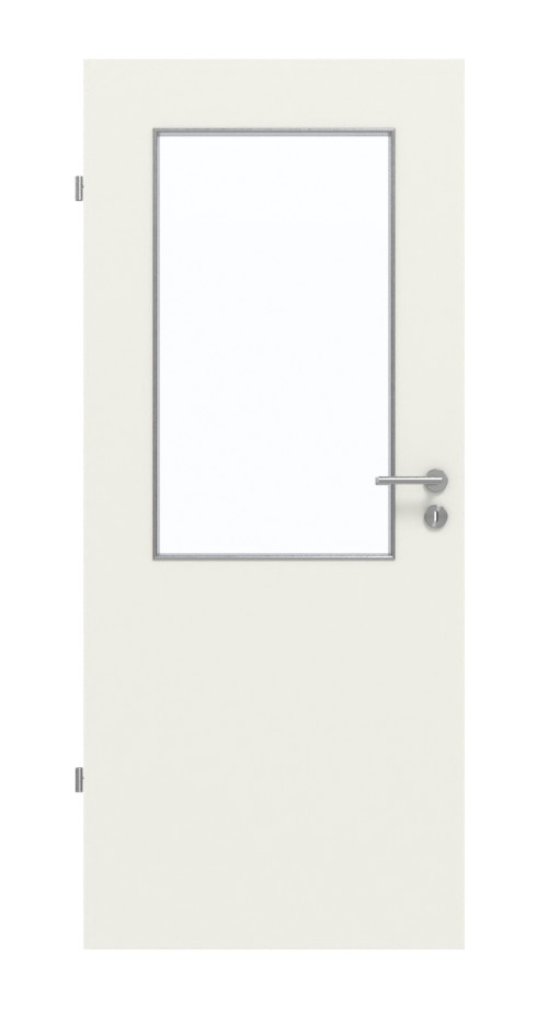 Szerokie przeszklenie określa górną połowę drzwi i zapewnia piękny dopływ światła. Minimalistyczny urok ma biało-szary dekor w kolorze Rain. Wytrzymała okładzina HPL jest odporna na zarysowania, uderzenia i ścieranie oraz łatwa w czyszczeniu.
