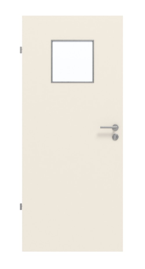 W górnej części skrzydła drzwiowego znajduje się kwadratowe przeszklenie o długości krawędzi 35 cm. Kremowo-biały dekor Dawncharakteryzuje się wszechstronnością i ponadczasowością. Zarysowania, ścieranie i uderzenia nie mają wpływu na niezwykle wytrzymałą powierzchnię HPL, odporną na działanie popularnych środków czyszczących.