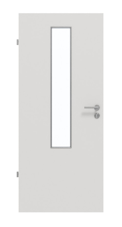 W środkowej części skrzydła drzwiowego wpuszczone jest krótkie, wąskie wycięcie na szybę. Jasna powierzchnia w kolorze Silver Grey ma drobną, piaskowaną fakturę. Wytrzymała powłoka HPL jest szczególnie odporna na zarysowania i ścieranie oraz na dostępne w handlu środki czyszczące.
