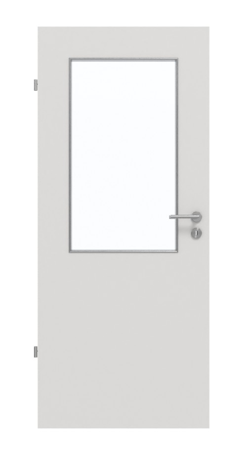 W górnej części drzwi znajduje się prostokątne wycięcie na szybę, otoczone listwami. Spokojny odcień szarości Silver Grey wygląda nowocześnie i harmonijnie. Towarzyszy mu delikatna, piaskowa struktura. Wytrzymały dekor HPL jest odporny na działanie światła, zarysowania, uderzenia i ścieranie i można go łatwo czyścić za pomocą dostępnych w handlu środków czyszczących.