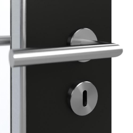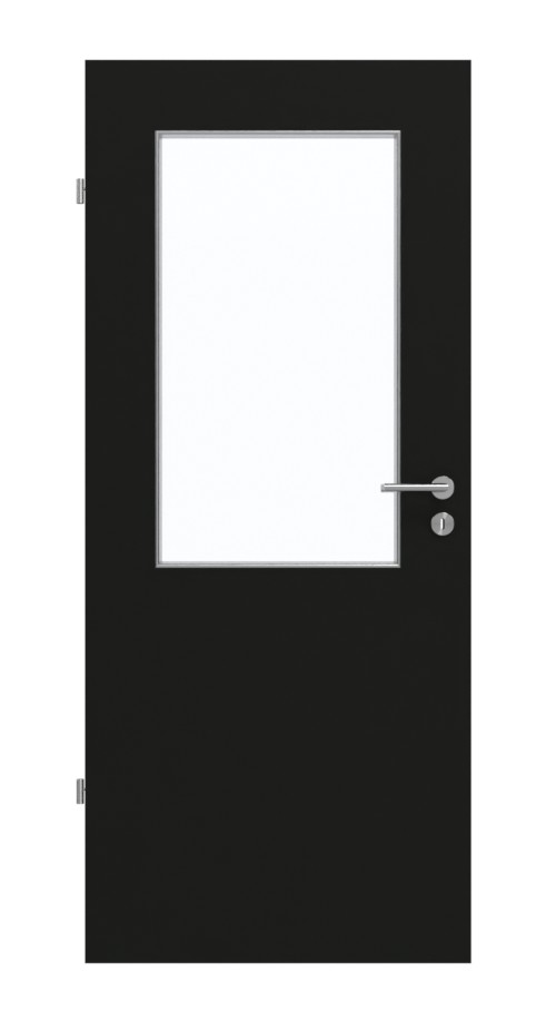 Górna połowa skrzydła drzwiowego zdobiona jest prostokątnym przeszkleniem. Modnym elementem przyciągającym wzrok jest czarna powierzchnia. Ciemny odcień fascynuje swoim eleganckim wyglądem. Zarysowania, ścieranie i uderzenia nie mają wpływu na niezwykle wytrzymałą powierzchnię HPL, odporną na działanie popularnych środków czyszczących.