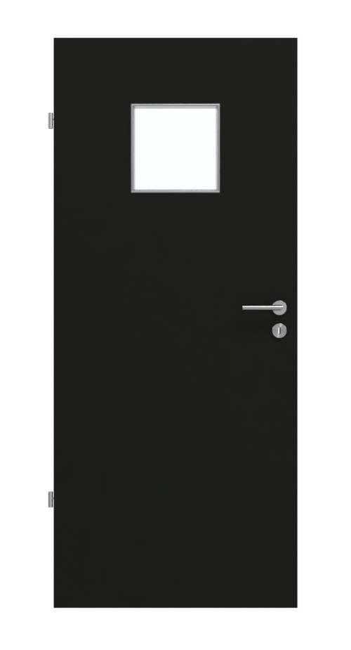 W górnej części skrzydła drzwiowego znajduje się kwadratowe przeszklenie. Głęboki kolor dekoru Black stanowi elegancki akcent w nowoczesnym wnętrzu. Wytrzymały dekor HPL jest odporny na działanie światła, zarysowania, uderzenia i ścieranie i można go łatwo czyścić za pomocą dostępnych w handlu środków czyszczących.