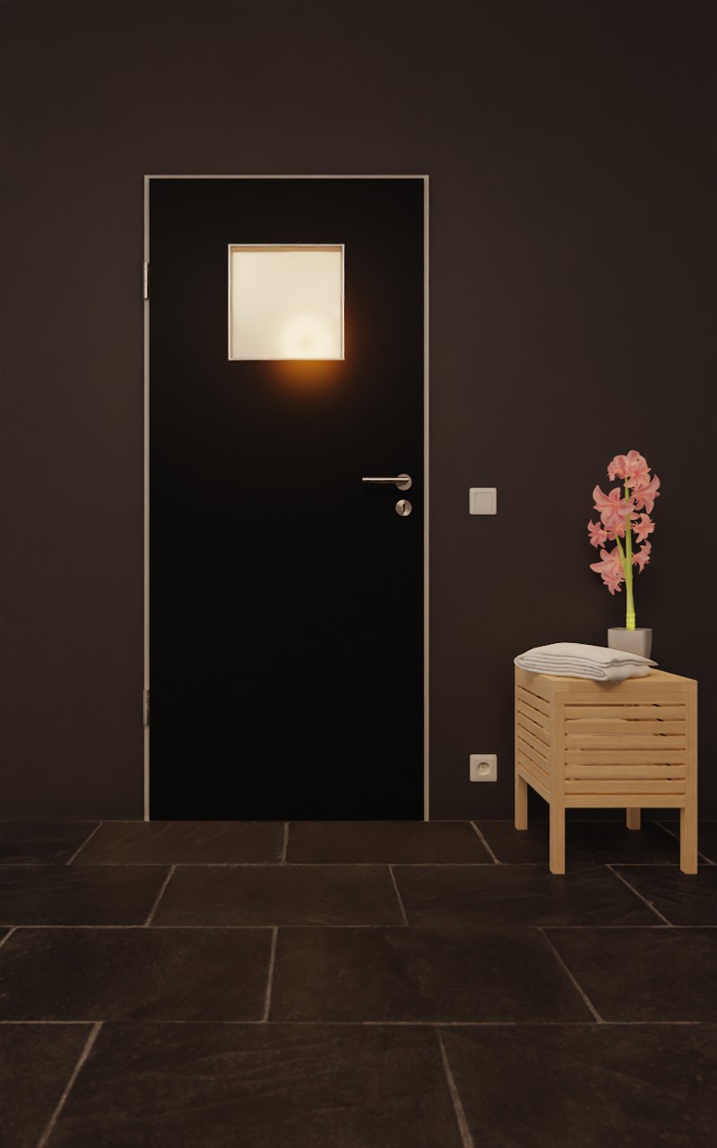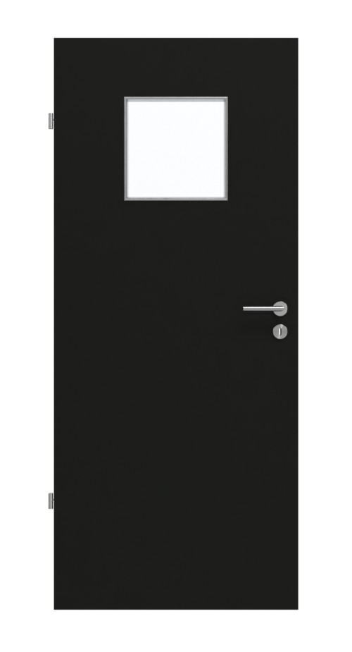 W górnej połowie skrzydła drzwiowego znajduje się kwadratowe wycięcie na szybę. Elegancki czarny dekor doskonale komponuje się z nowoczesnym wystrojem wnętrz. Wytrzymała powłoka HPL jest szczególnie odporna na zarysowania i ścieranie oraz na dostępne w handlu środki czyszczące.
