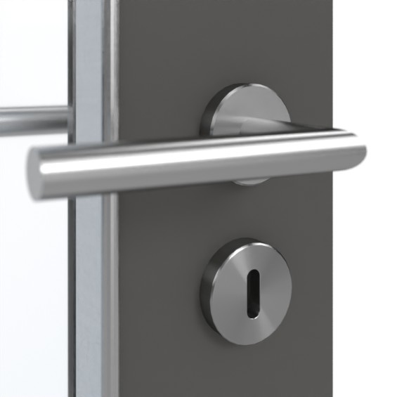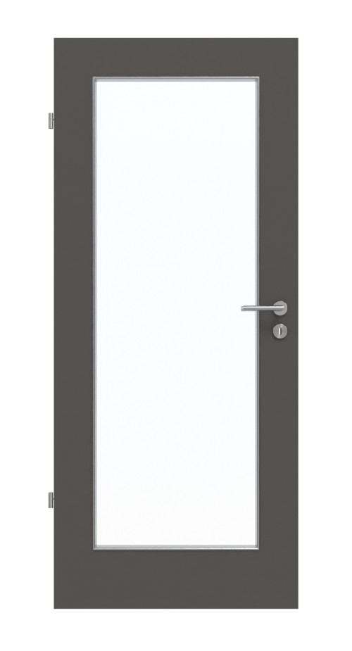 Duże, prostokątne przeszklenie w środkowej części skrzydła drzwiowego zapewnia dodatkowe światło w pomieszczeniach. Nałożone listwy przyszybowe towarzyszą wycięciu. Drzwi zyskują nowoczesny charakter dzięki eleganckiemu odcieniu szarości Ebony. Wytrzymała warstwa HPL jest odporna na ścieranie, uderzenia i zarysowania oraz wyjątkowo odporna na działanie światła.