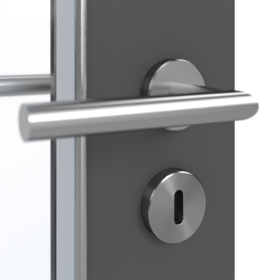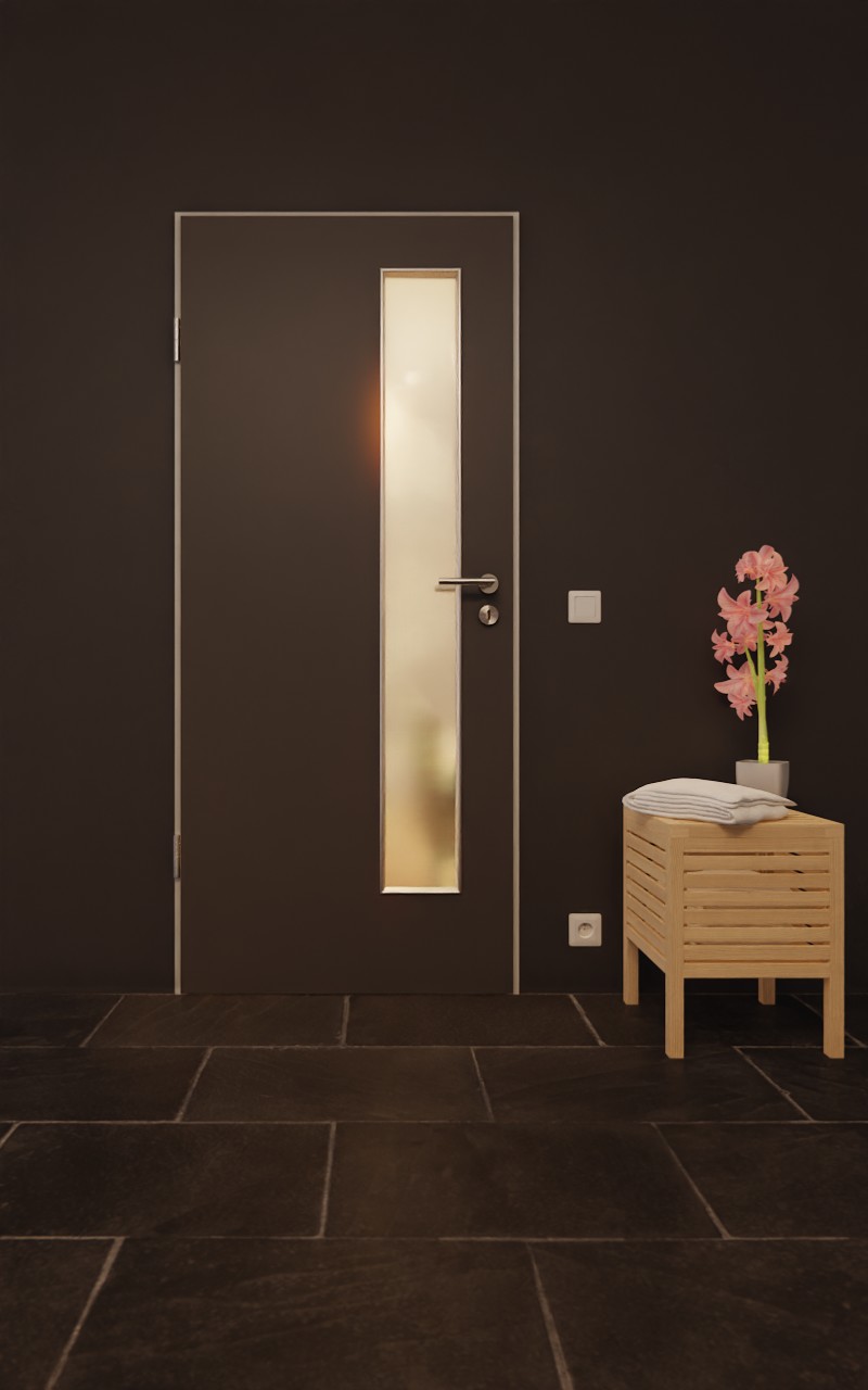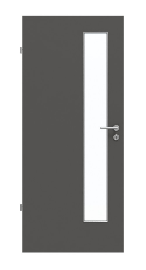 Wąskie, prostokątne wycięcie na szybę zapewnia dyskretny dopływ światła. Drzwi zyskują nowoczesny charakter dzięki eleganckiemu odcieniu szarości Ebony. Wytrzymała warstwa HPL jest odporna na ścieranie, uderzenia i zarysowania oraz wyjątkowo odporna na działanie światła.