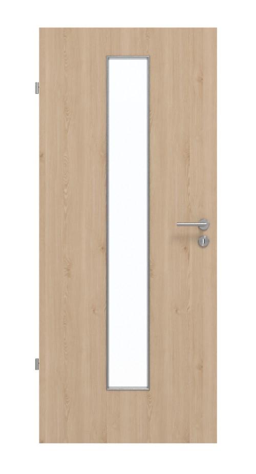 W środkowej części drzwi znajduje się wąskie przeszklenie. Delikatne słoje rozciągają się na beżowym dekorze drewnianym Authentic Achat. Wytrzymała okładzina HPL jest odporna na zarysowania, uderzenia i ścieranie oraz łatwa w czyszczeniu.