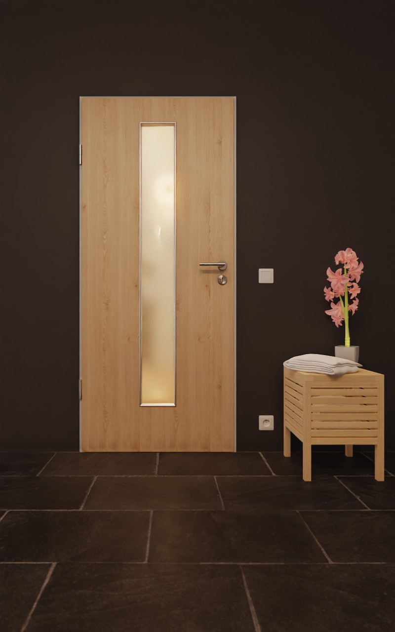 Drzwi do pomieszczeń wilgotnych są odporne na sporadyczne zachlapania wodą i krótkotrwałe spływanie skroplin. Ponadto jest odporna na wahania temperatury i wysoką wilgotność powietrza przez krótki czas. Wystarczającą stabilność zapewnia pełna wkładka z płyty wiórowej w rdzeniu skrzydła drzwiowego. Dzięki przypisaniu do klasy obciążenia M drzwi do pomieszczeń wilgotnych doskonale nadają się do użytku prywatnego.