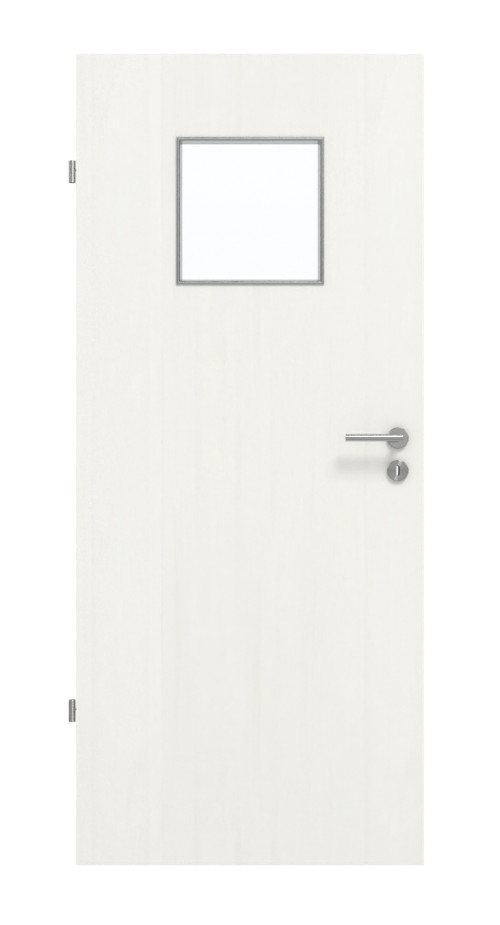 Prostoliniowy element wystroju stanowi umieszczone na środku kwadratowe wycięcie na szybę w górnej części drzwi. Biały wzór Authentic Bianco zachwyca swoim przyjaznym wyglądem. Zarysowania, ścieranie i uderzenia nie mają wpływu na niezwykle wytrzymałą powierzchnię HPL, odporną na działanie popularnych środków czyszczących.