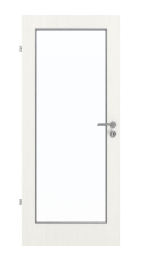 Dodatkowy dopływ światła zapewnia prostokątne wycięcie na szybę, które zajmuje większą część skrzydła drzwiowego. Dzięki delikatnemu usłojeniu i jasnej barwie wzór Authentic Bianco nadaje wnętrzu świeży i naturalny wygląd. Wytrzymała powłoka HPL jest szczególnie odporna na zarysowania i ścieranie oraz na dostępne w handlu środki czyszczące.