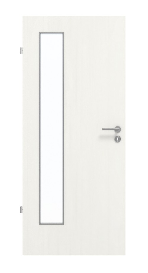 Swoją nowoczesną estetykę drzwi zawdzięczają wąskiemu przeszkleniu po stronie zawiasów. W świeżym białym wzorze Authentic Bianco widoczne są delikatne słoje przypominające drewno. Wytrzymały dekor HPL jest odporny na działanie światła, zarysowania, uderzenia i ścieranie i można go łatwo czyścić za pomocą dostępnych w handlu środków czyszczących.
