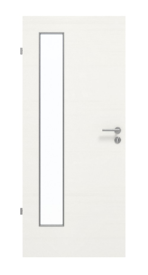 Prostokątne przeszklenie po stronie zawiasów skrzydła drzwiowego ma szerokość prawie 20 cm. Autentyczne i subtelne słoje drewna rozciągają się w poprzek nowoczesnego białego dekoru Authentic Bianco. Wytrzymały dekor HPL jest odporny na działanie światła, zarysowania, uderzenia i ścieranie i można go łatwo czyścić za pomocą dostępnych w handlu środków czyszczących.