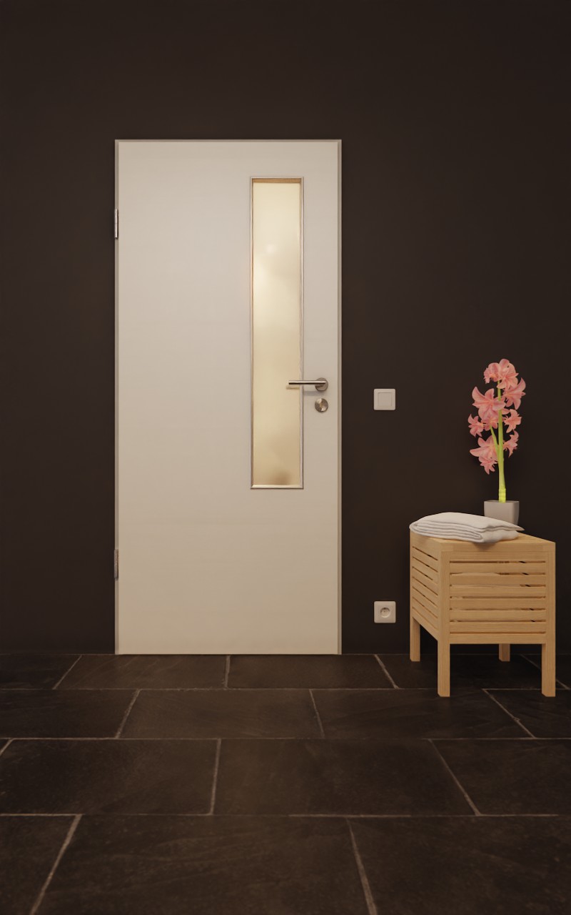 Krótkie, prostokątne przeszklenie o szerokości zaledwie 20 cm znajduje się po stronie zamka skrzydła drzwiowego. Drobne usłojenia w układzie poprzecznym subtelnie rozciągają się na białym dekorze Authentic Bianco. Wytrzymała warstwa HPL jest odporna na ścieranie, uderzenia i zarysowania oraz wyjątkowo odporna na działanie światła.