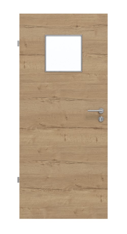 Nowoczesne drzwi do pomieszczeń wilgotnych zachwycają powierzchnią HPL w kolorze Quer Authentic Risseiche oraz efektownym przeszkleniem: