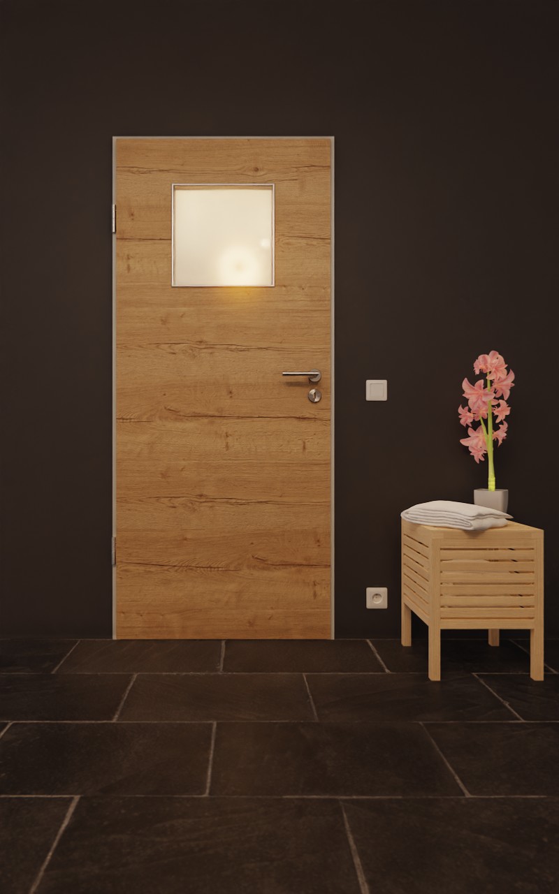 Drzwi do pomieszczeń wilgotnych wyróżniają się trwałą i odporną powłoką HPL oraz skutecznym przeszkleniem: