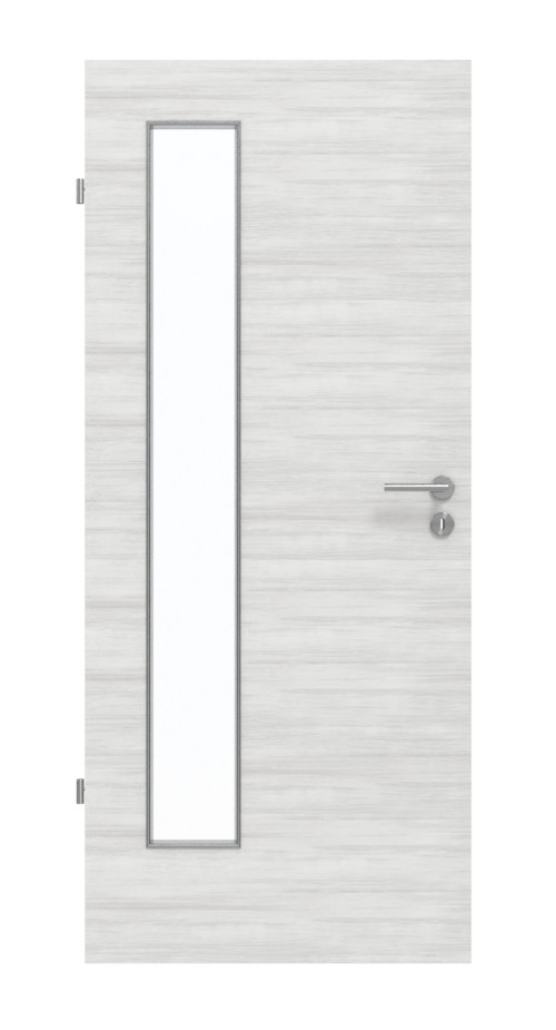 Wycięcie na szybę po stronie zawiasów stanowi ładny akcent. Poziome cieniowania przechodzą przez subtelny odcień szarości dekoru Quer Authentic Grigio. Wytrzymała warstwa HPL jest odporna na ścieranie, uderzenia i zarysowania oraz wyjątkowo odporna na działanie światła.