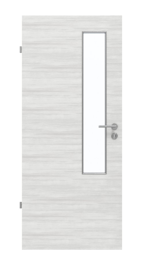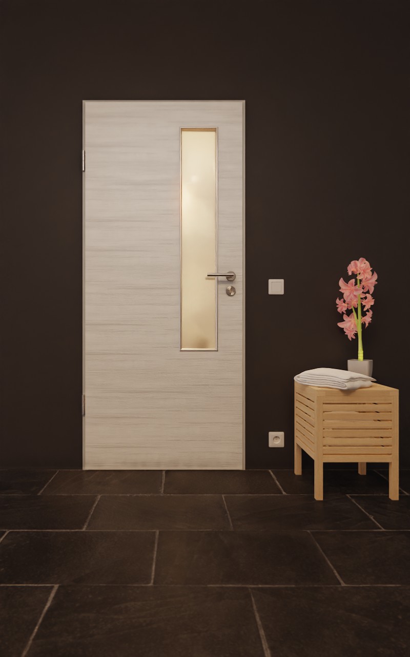 Szczególnym elementem wystroju jest wąskie wycięcie na szybę po stronie zamka w górnej części drzwi. Delikatny szary odcień dekoru Quer Authentic Grigio podkreślają poziome cieniowania. Wytrzymały dekor HPL jest odporny na działanie światła, zarysowania, uderzenia i ścieranie i można go łatwo czyścić za pomocą dostępnych w handlu środków czyszczących.