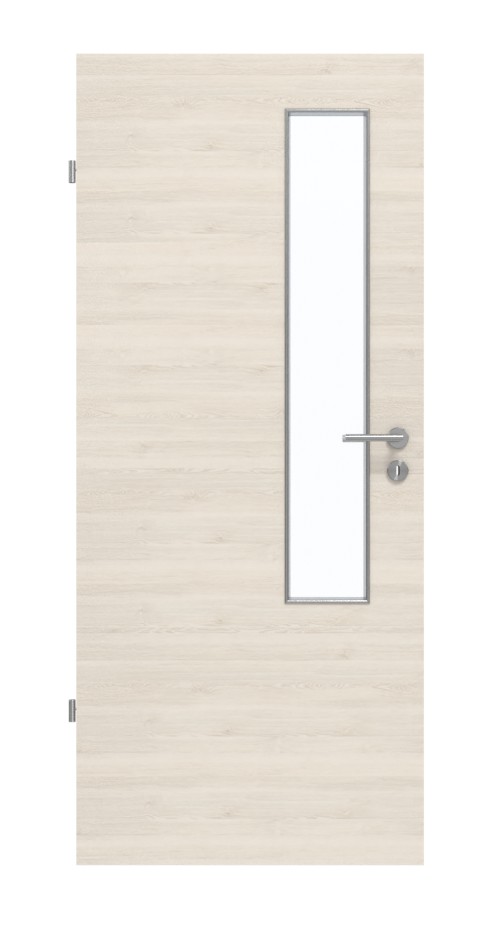 W górnej części drzwi wąskie, prostokątne przeszklenie zdobi stronę zamka. Delikatne, poziome usłojenie tworzy jasny wzór drewna dekoru Quer Authentic Perl. Wytrzymała powłoka HPL jest szczególnie odporna na zarysowania i ścieranie oraz na dostępne w handlu środki czyszczące.