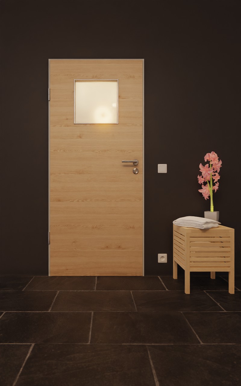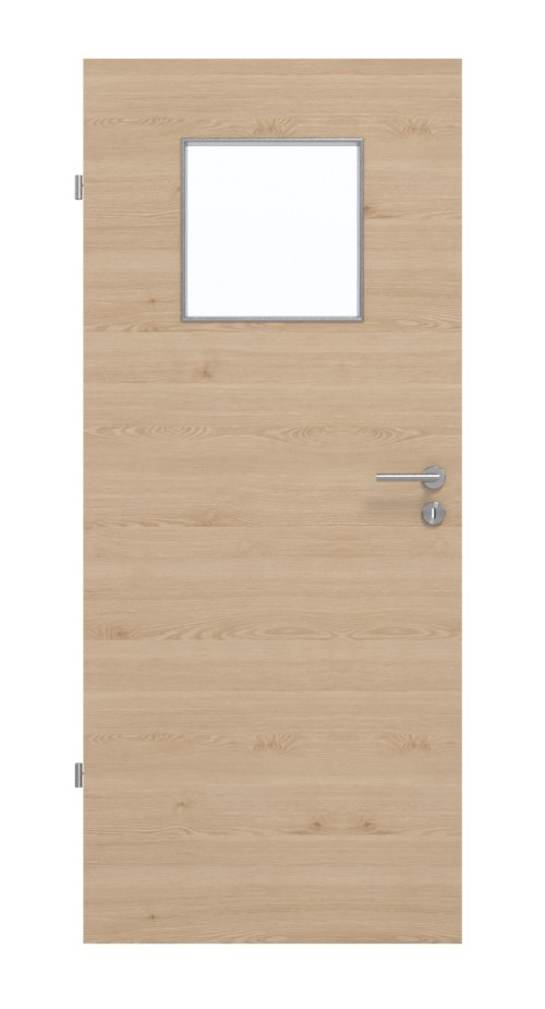 W górnej części skrzydła drzwiowego znajduje się kwadratowe przeszklenie. Jasne odcienie beżu i brązu łączą się w dekorze drewnianym Authentic Achat Quer z delikatnym, poziomym usłojeniem. Wytrzymała i odporna na światło warstwa wierzchnia HPL jest odporna na zarysowania i ścieranie i została zaprojektowana z myślą o codziennym intensywnym użytkowaniu.
