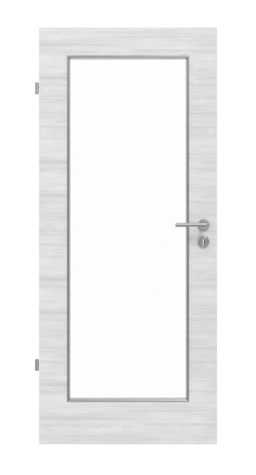 W środkowej części skrzydła drzwiowego znajduje się duże, prostokątne przeszklenie, które zapewnia dodatkowe oświetlenie pomieszczeń. Jest ono wyposażone w nakładane listwy przyszybowe. Poziome cieniowanie sugeruje naturalne usłojenie drewna i dopełnia nowoczesny wygląd jasnoszaryego dekoru Quer Authentic Grigio. Wytrzymała i odporna na światło warstwa wierzchnia HPL jest odporna na zarysowania i ścieranie i została zaprojektowana z myślą o codziennym intensywnym użytkowaniu.