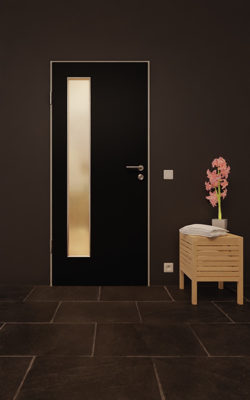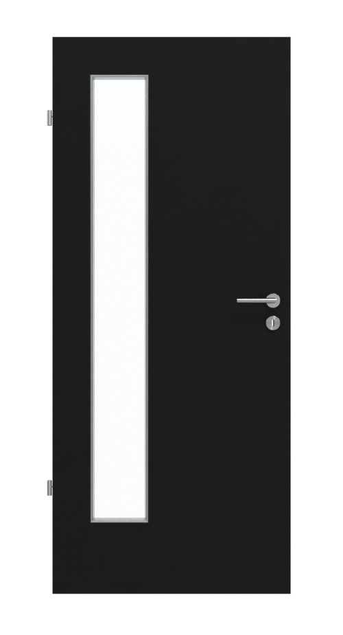 Po stronie zawiasów wzdłuż całej długości skrzydła drzwiowego znajduje się wąskie przeszklenie. Dzięki drobnej, perłowej strukturze czarny dekor Black jest przyjemny w dotyku. Wytrzymała warstwa HPL jest odporna na ścieranie, uderzenia i zarysowania oraz wyjątkowo odporna na działanie światła.