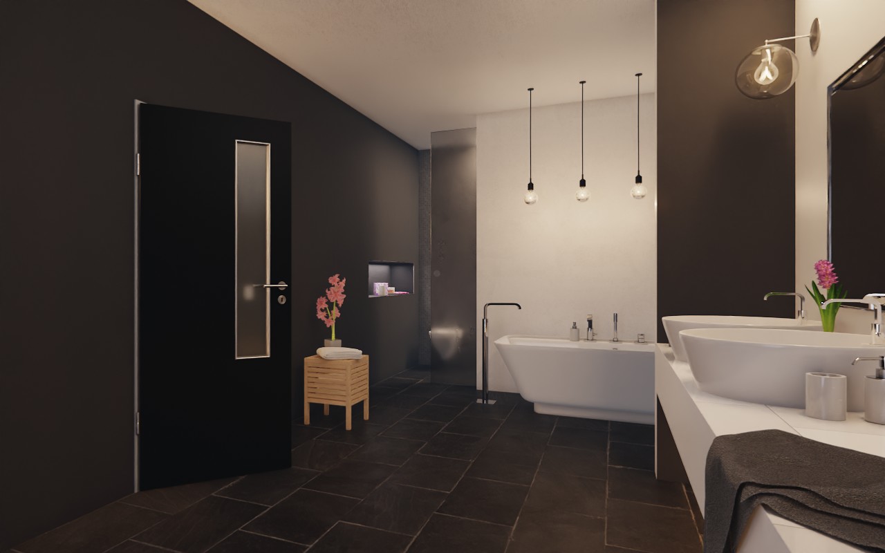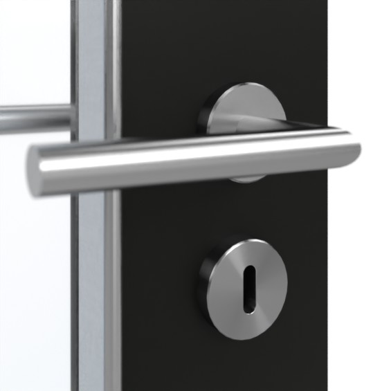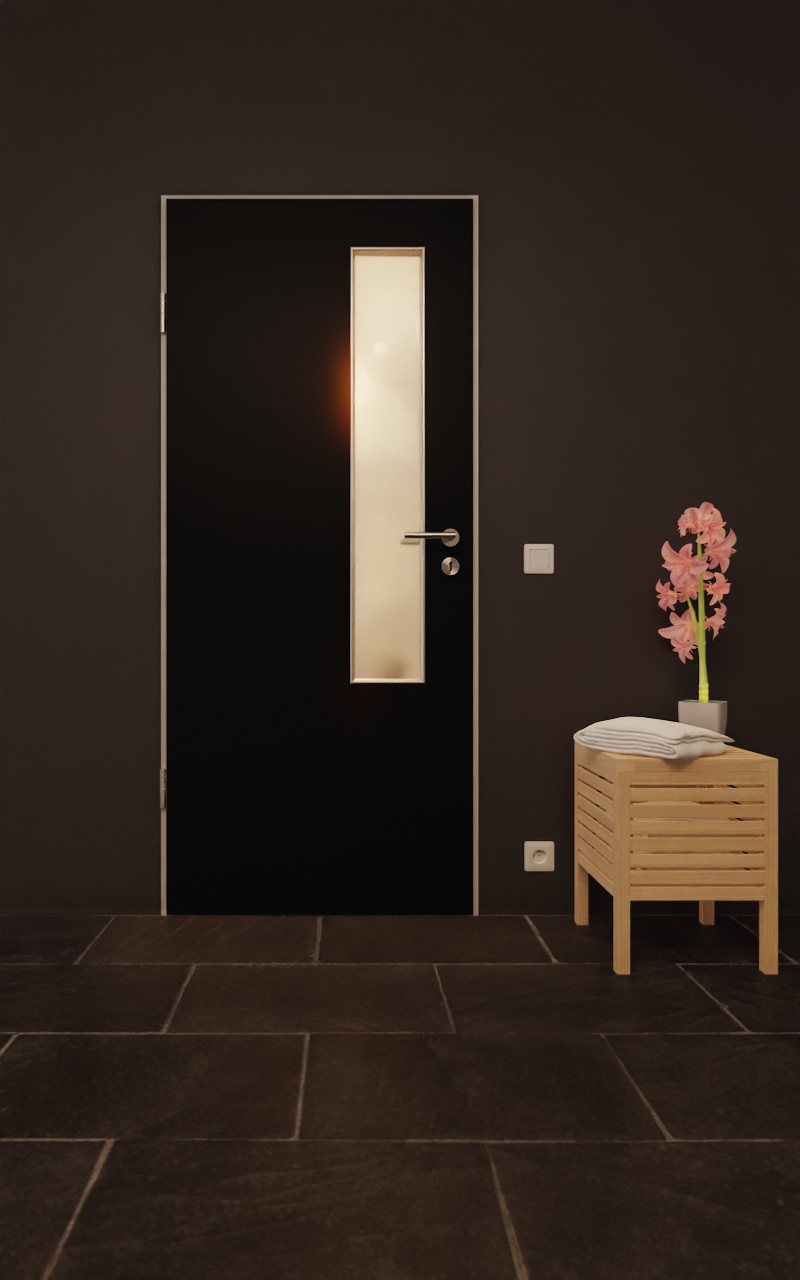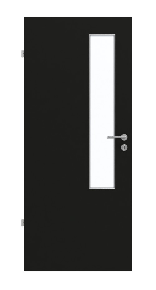 Po stronie zamka drzwi znajduje się wąskie przeszklenie. Dzięki drobnej, perłowej strukturze czarny dekor Black jest przyjemny w dotyku. Wytrzymała powłoka HPL jest szczególnie odporna na zarysowania i ścieranie oraz na dostępne w handlu środki czyszczące.