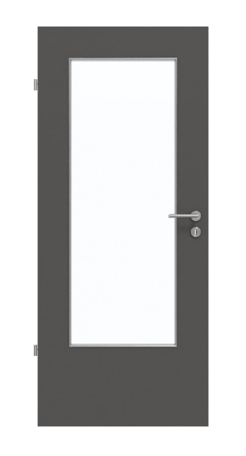 W środkowej części skrzydła drzwiowego duży, prostokątny otwór przeszklony zapewnia dodatkowe oświetlenie pomieszczenia. Nowoczesny urok podkreśla ciemnoszary dekor w kolorze Ebony. Wytrzymała okładzina HPL jest odporna na zarysowania, uderzenia i ścieranie oraz łatwa w czyszczeniu.