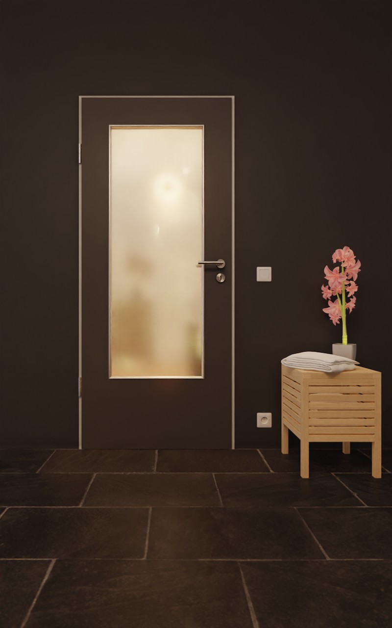 Stylowa drzwi do pomieszczeń wilgotnych od Garant wyróżnia się odporną powłoką HPL i prostym wycięciem szklanym: