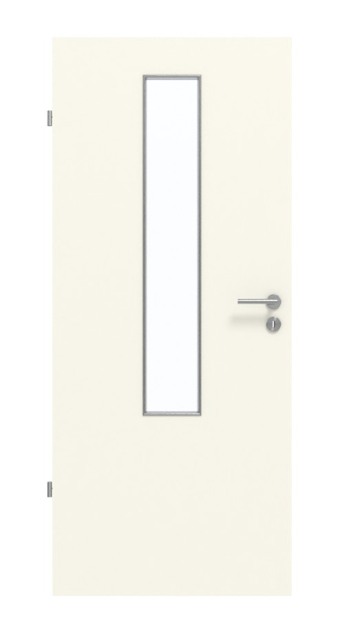 Prostokątne przeszklenie pośrodku skrzydła drzwiowego ma szerokość prawie 20 cm. Pozwala na delikatny dopływ światła. Jednolity dekor Snow White urzeka neutralnym wyglądem i drobną strukturą przypominającą piasek. Wytrzymały dekor HPL jest odporny na działanie światła, zarysowania, uderzenia i ścieranie i można go łatwo czyścić za pomocą dostępnych w handlu środków czyszczących.