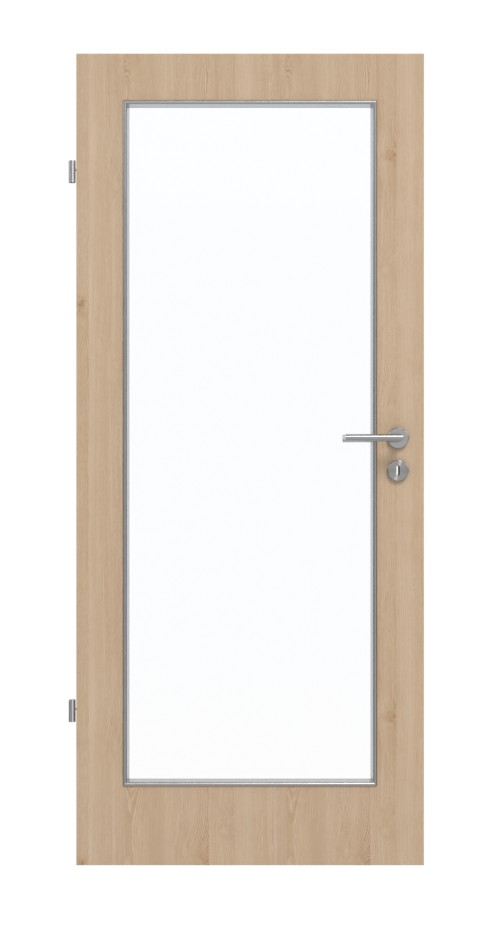 O dużą ilość światła w pomieszczeniu dba prostokątny wycięty fragment szyby, który zajmuje większość skrzydła drzwi. Dzięki delikatnym słojom o podłużnym układzie dekor Authentic Achat tworzy wygląd drewna zbliżony do naturalnego. Wytrzymała powłoka HPL jest szczególnie odporna na zarysowania i ścieranie oraz na dostępne w handlu środki czyszczące.